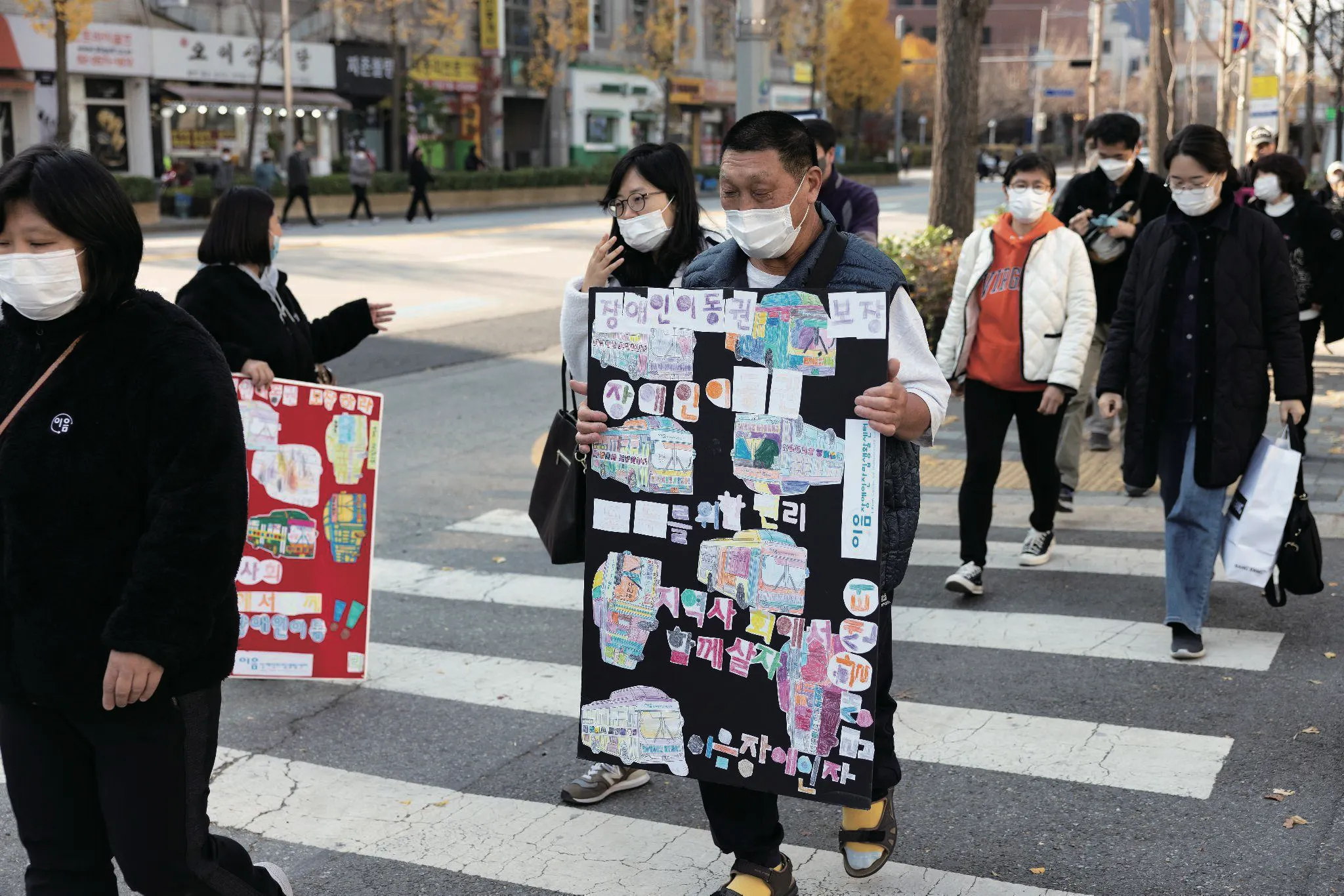 권리중심공공일자리 노동자가 장애인 이동권 보장을 위한 권익옹호 활동으로 플래카드를 직접 제작하여 행진하고 있다.