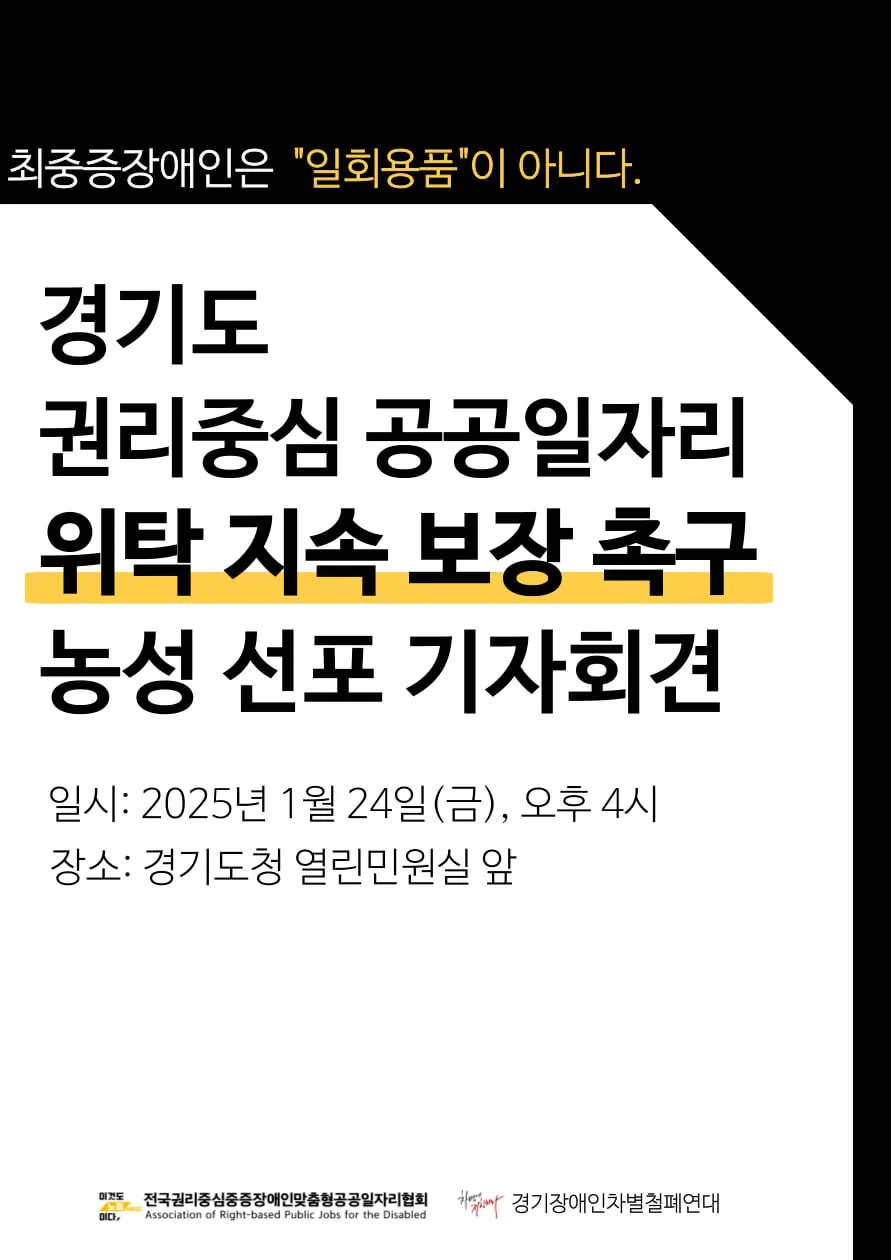 제목 | [보도자료] ‘최중증장애인은 “일회용품”이 아니다!’ 경기도 권리중심공공일자리 위탁 지속보장 촉구 농성 선포 기자회견 |