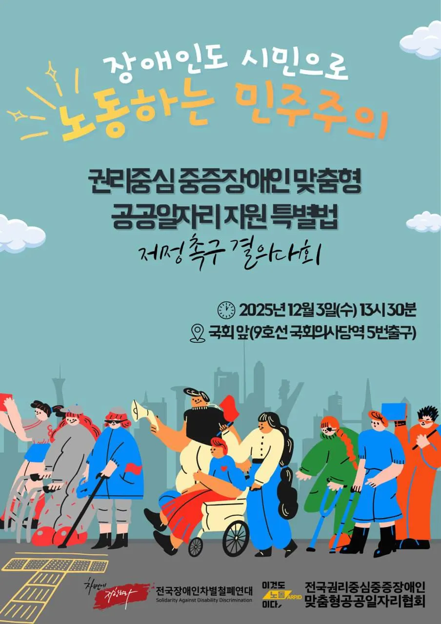 이를 위해 12월 3일 세계장애인의날에 국회의사당 앞에서 “장애인도 시민으로 노동하는 민주주의 - 권리중심 중증장애인맞춤형 공공일자리 지원 특별법 제정 촉구 결의대회”를 진행합니다.