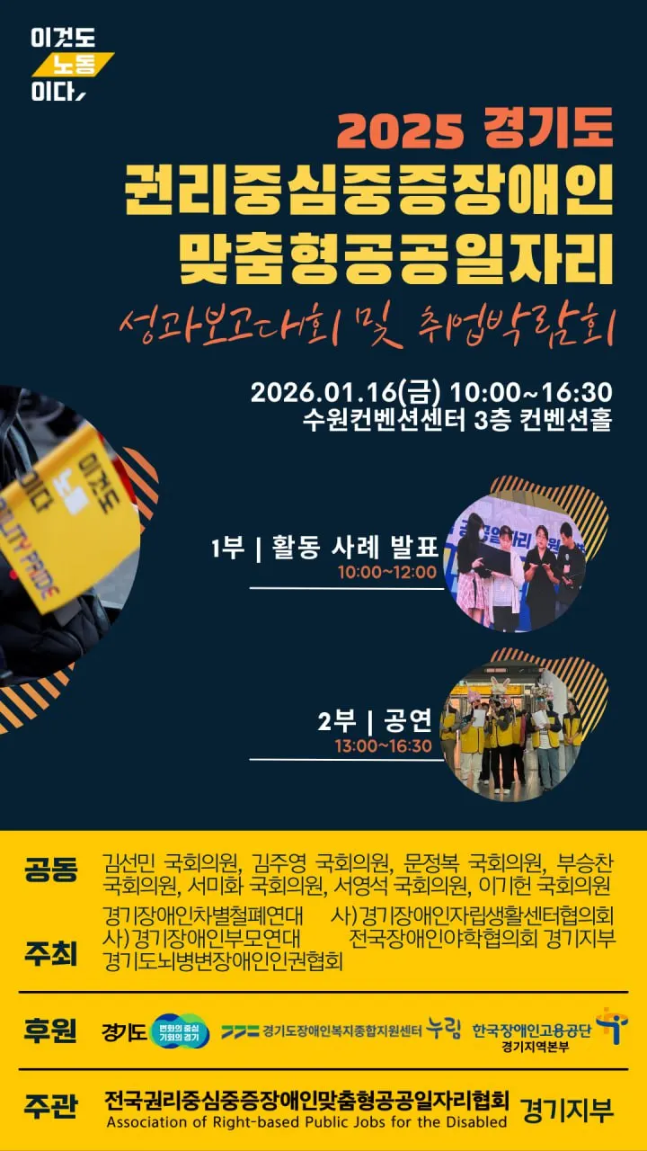 오는 1월 16일(금) 오전 10시, 수원컨벤션센터에서 2025 경기도 권리중심중증장애인 맞춤형공공일자리 성과보고대회 및 취업박람회를 개최합니다. 경기 취업박람회는 경기도 권리중심공공일자리 노동자들의 한 해 성과를 공유하고, 중증장애인 노동권 보장을 위한 향후 과제를 사회적으로 논의하기 위해 마련되었습니다.